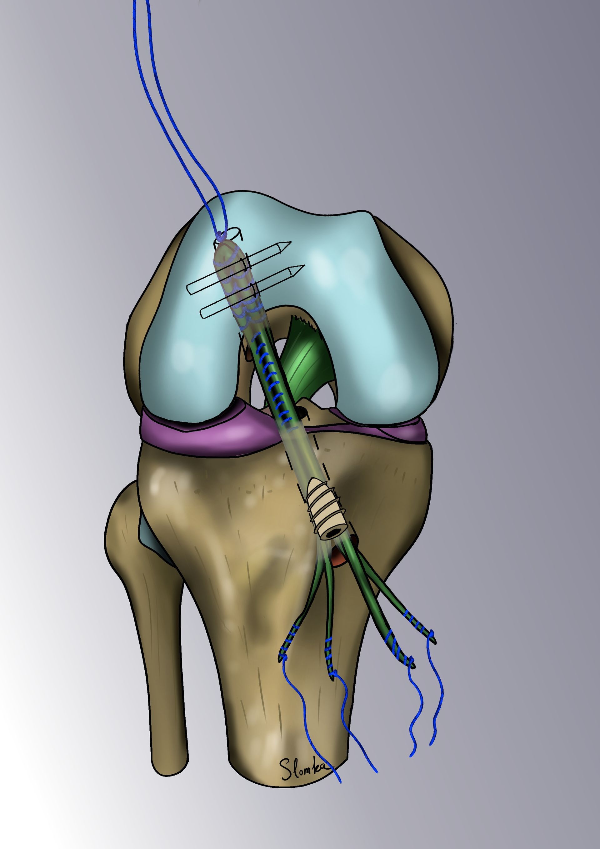 Nos techniques sont dérivées de la technique décrite par le Dr Slomka : cette intervention s’appelle la ligamentoplastie « mini-invasive » ou par « mini-cicatrice » sous arthroscopie.