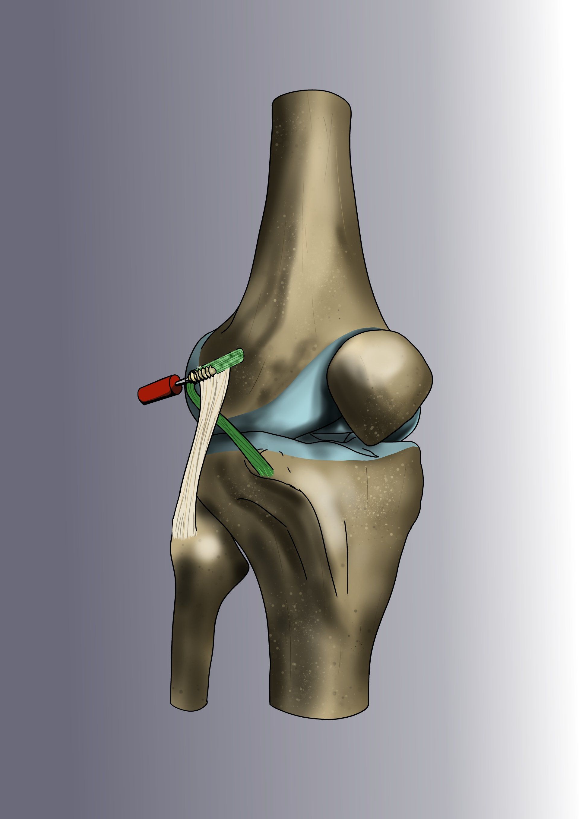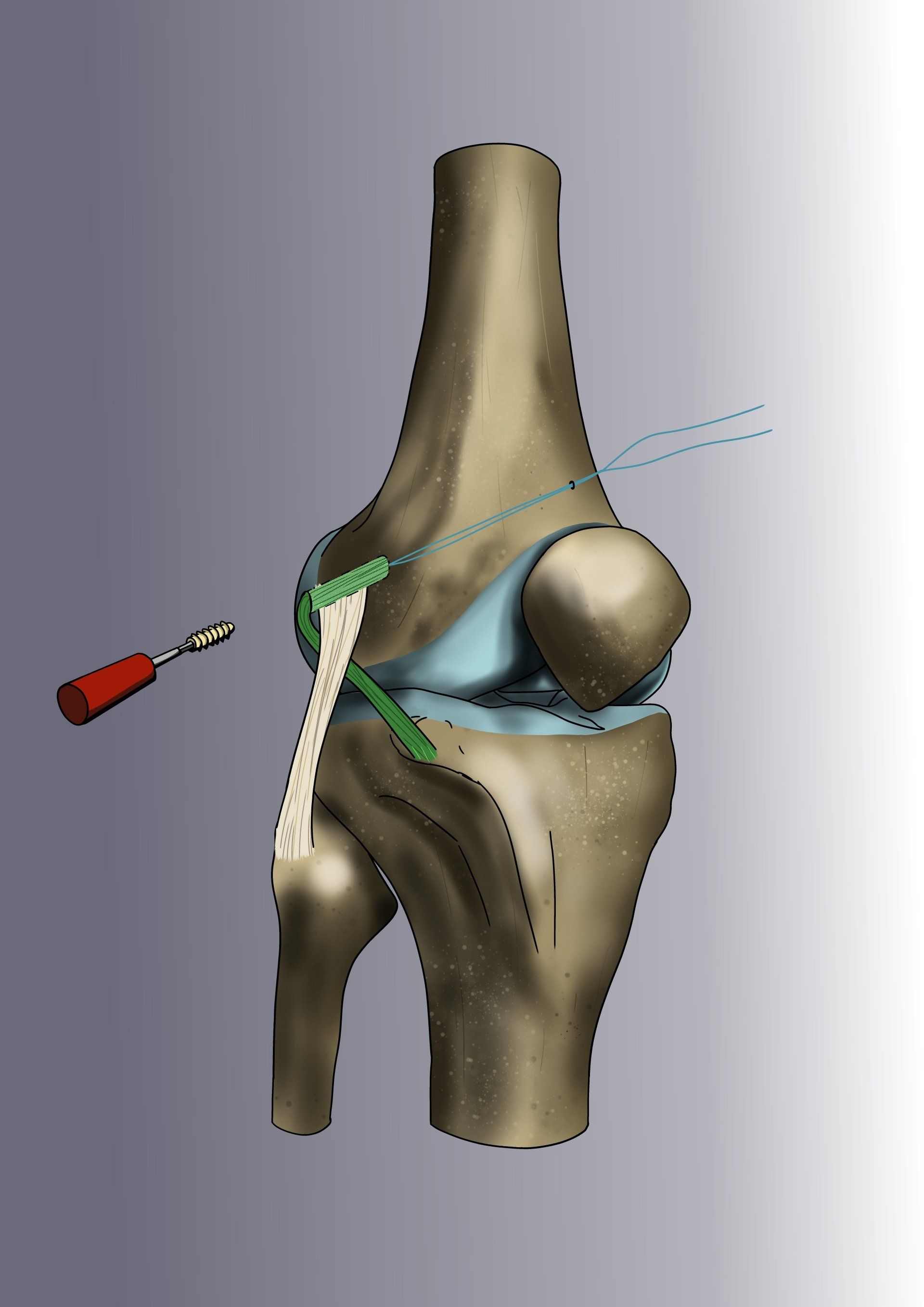 Le chirurgien contrôle les gestes de microchirurgie sur un écran 4K sans jamais avoir besoin d’ouvrir le genou. La greffe va remplacer le LCA rompu et sera fixée au fémur par un système résorbable appelé « RIGIDFIX » de dernière génération et au tibia par une vis résorbable. La greffe va se souder aux os en quelques semaines et remplacera définitivement le LCA.